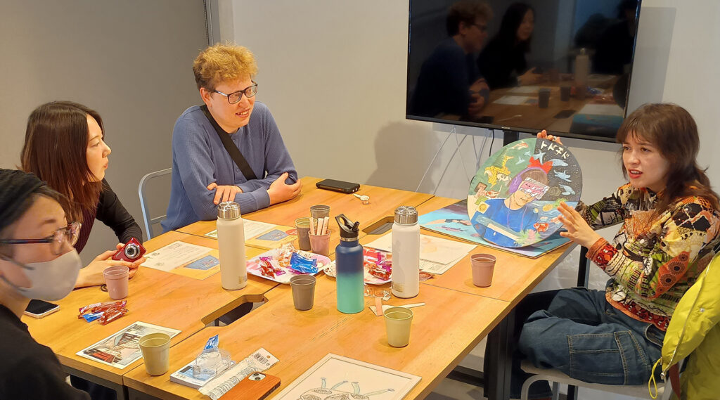 テーブルの上には、キャンバス作品の写真、ポートフォリオ、過去のワークショップで制作した作品、好きなアーティストの資料。誰かの「好き」が並びはじめると、空気は一気に柔らかくなります。